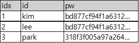 예를 들어 kim의 해시값은 `qwer12341sda`를 해싱해서 나온 것이고, lee의 해시값은 `qwer1234fh2k`를 해싱해서 나온 것이다.