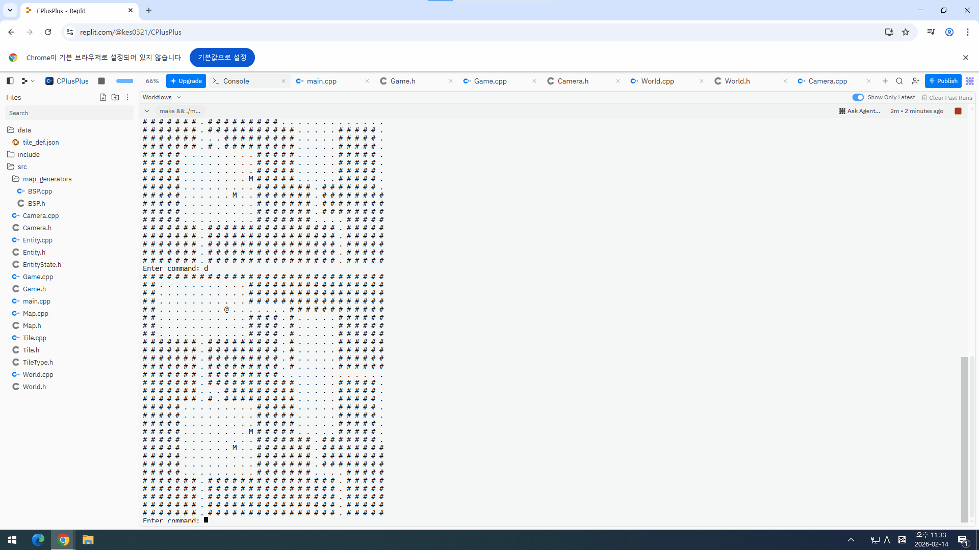 카메라에 따른 렌더링을 구현을 마치고 플레이해보았는데 플레이어가 오른쪽으로 쭉 갈 때 어느 순간부터 출력되는 맵의 크기가 한 칸 줄어드는 문제가 생겼다. 왜 그러냐 에이전트에게 물어보았더니 지 혼자 내 코드를 막 뜯어보더니 수정까지 해서 결국 버그를 해결하였다.